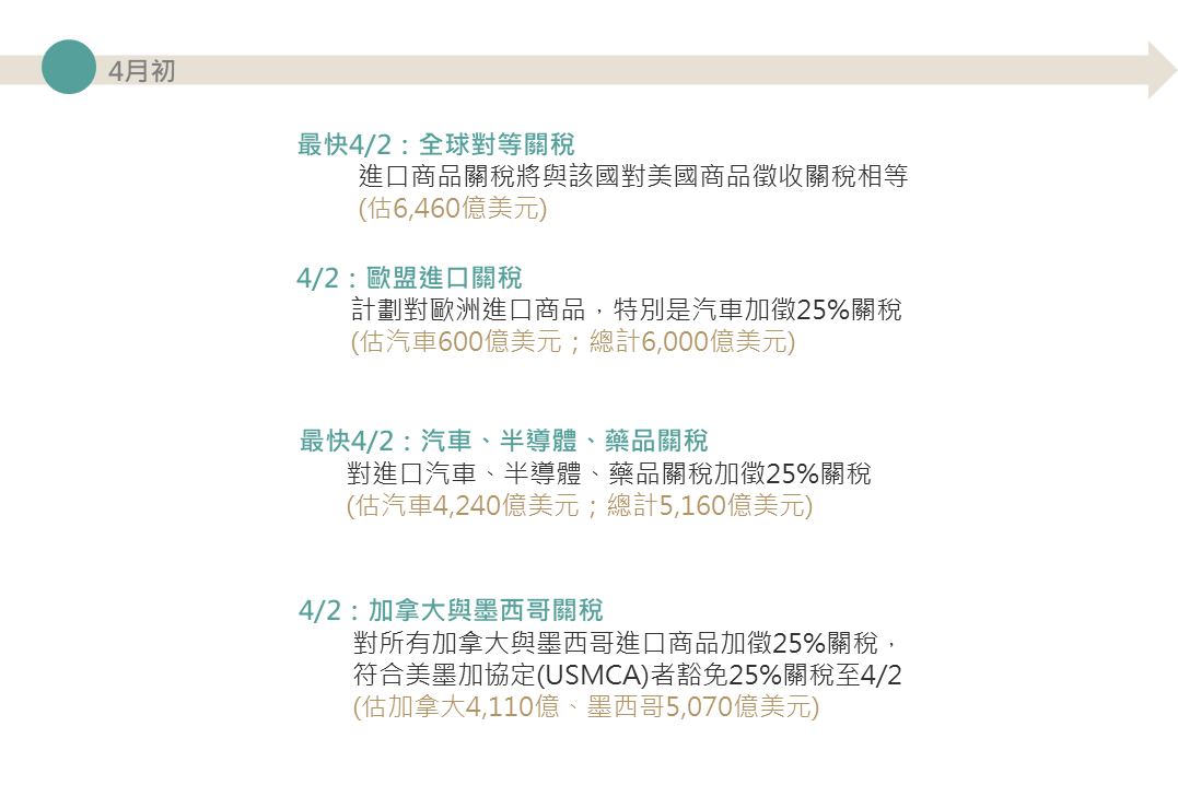 根據美國銀行的預測,超過五成的受訪者認為,「貿易戰引發全球經濟衰退」是當前市場面臨的最大風險。自川普上任以來,已陸續宣布對中國、加拿大及墨西哥商品加徵進口關稅,全球性的鋼鋁關稅也於三月十二日正式生效,針對全球其他國家可能採取之對等關稅措施,預計最快將於今年四月有進一步消息。