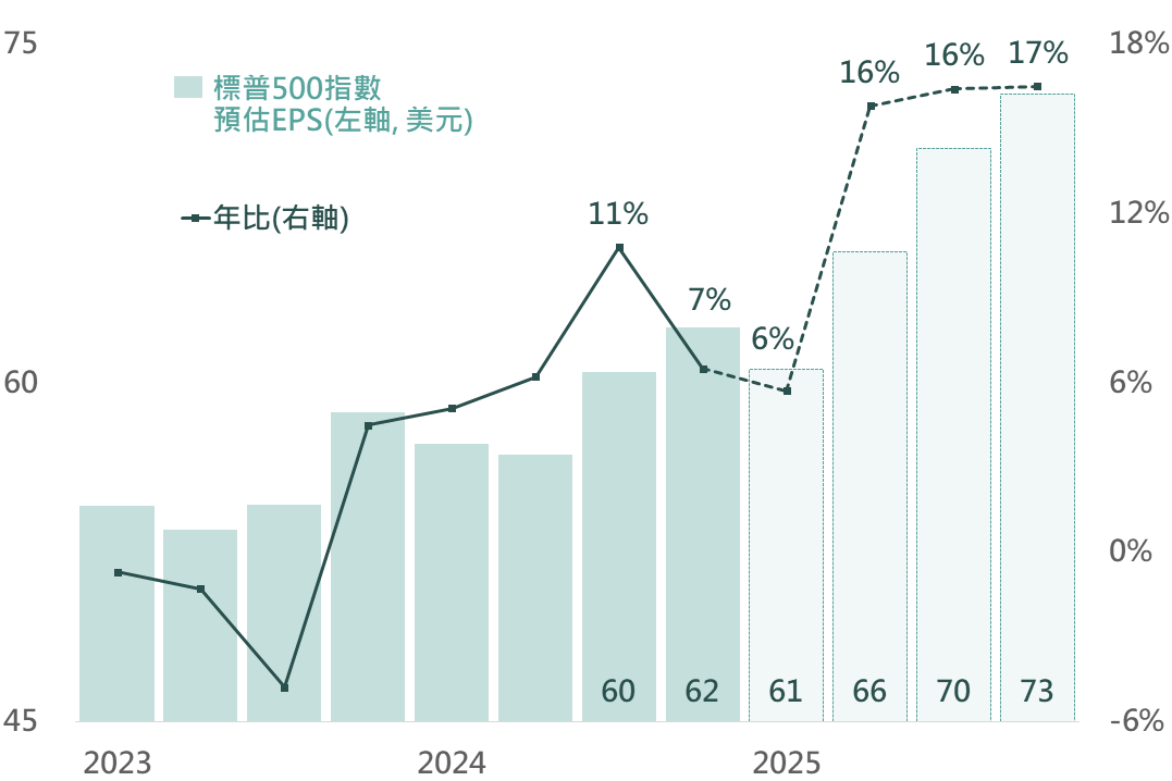 就企業獲利而言,分析師對標普500指數成分股的整體每股盈餘(EPS)預估中位數顯示,2025年起四個季度的EPS成長率分別為6%、16%、16%與17%;除第一季度外,其餘季度的盈餘成長率均維持雙位數,為股市提供支撐。基於上述,玉山銀行投資研究中心認為在消化完負面因素後,市場仍存在進一步擴張的機會。
