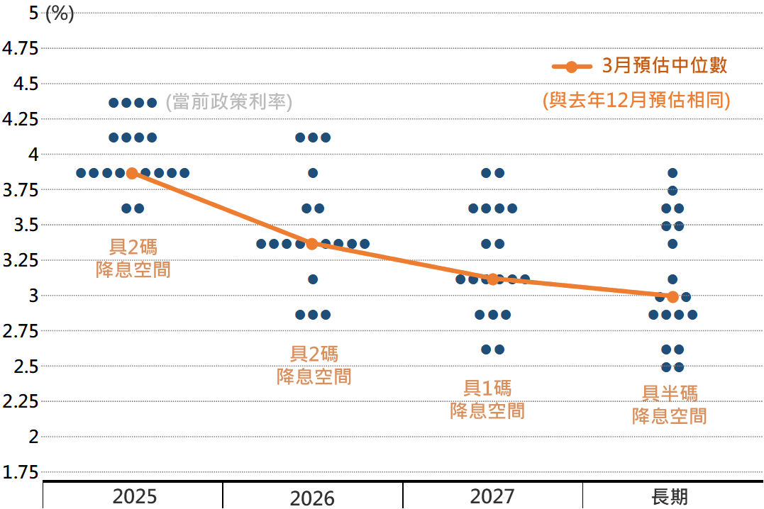 ▲ Fed政策利率點陣圖及官員預估中位數路徑