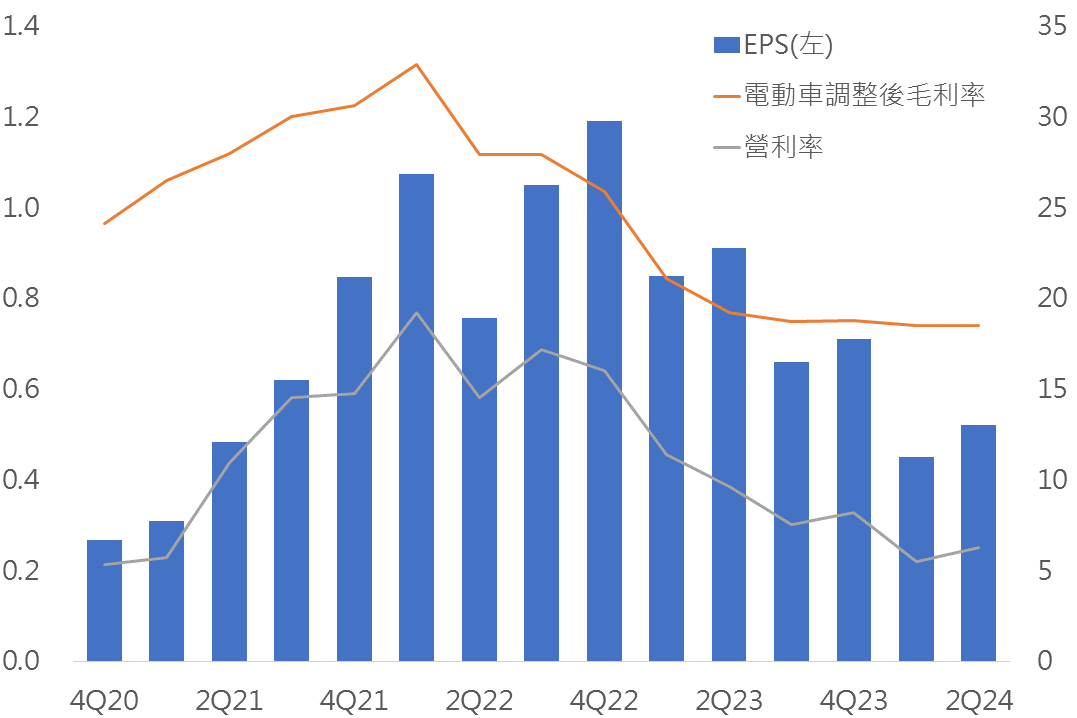 營收/EPS為 255億美元/0.52美元 (預估:246億美元/0.6美元),其中獲利率(14.4%)大幅低於預期(16.4%),顯示整體電動車市依舊疲軟、削價競爭持續影響獲利能力。