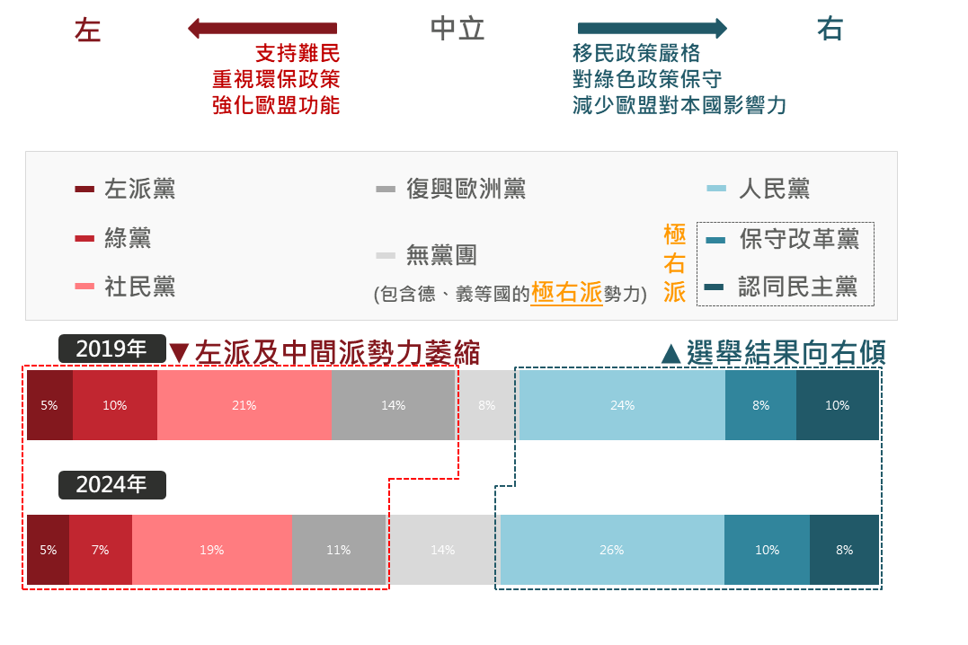 近年來,歐洲因接納大量難民而產生社會問題,以及未有效處理疫情和俄烏戰爭導致的物價上漲和能源供應隱憂,使得極右翼勢力抬頭。6月歐洲議會選舉,立場中間偏右的歐洲人民黨維持最多席位,但極右派席次大增,較上屆增加30席,尤其在德國和法國,極右派得票超過執政黨,增加了未來5年歐盟政策右傾的風險。