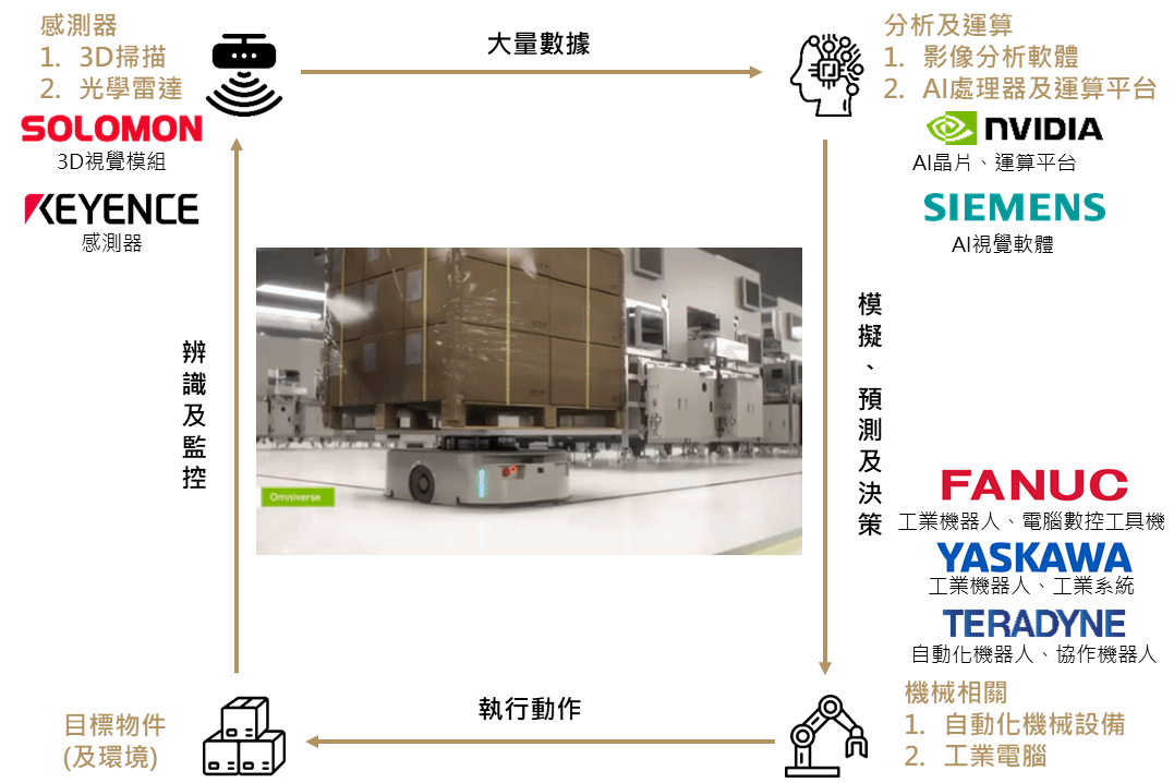 除了消費性電子換機潮之外,AI機器人也被視為下一波具成長潛力的領域。在Computex展會上,輝達執行長黃仁勳表示:「未來所有工廠都會變成機器人工廠。」與傳統機械式的工廠之自動化設備不同,AI機器人將透過各種感測器,模擬、預測並做出更明智的決策,這可能為製造業帶來下一波工業革命。