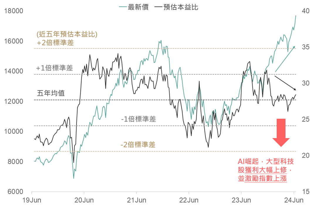 在股價創高之際,許多投資人將漲多視為一大風險,但實際上自去年5月AI龍頭輝達上調全年財測以來,那斯達克和美股七巨頭指數實際獲利(EPS)成長率分別達16.2%和75%,在AI商機擴散至更多科技股並帶動實際獲利成長同時,未來獲利有望持續增長,使評價仍屬合理,因此玉山銀行評估科技類股仍將引領下半年全球股市表現。