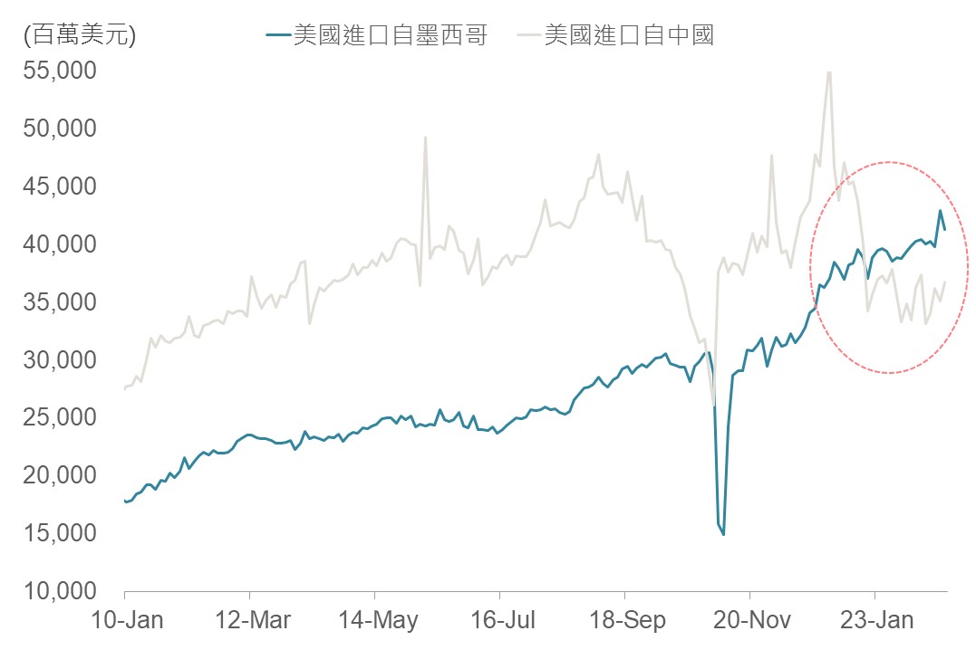 此外,墨西哥雖受惠於近岸外包政策成為美國第一大貿易大國,然中國透過設廠於墨西哥規避美國關稅的舉措,使美方可能對墨國施加壓力,並影響2026年美墨加貿易協定(USMCA)重新談判之結果,對新任政府形成重大挑戰,故謹慎看待墨西哥市場後續發展。