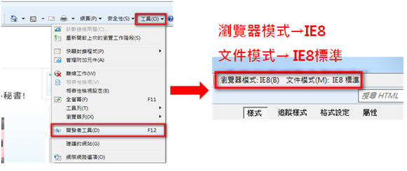 2.承上,當您已使用IE8以上版本,但網頁版面仍移位時,請設定IE瀏覽器中「開發者工具」的「瀏覽器模式」與「文件模式」。