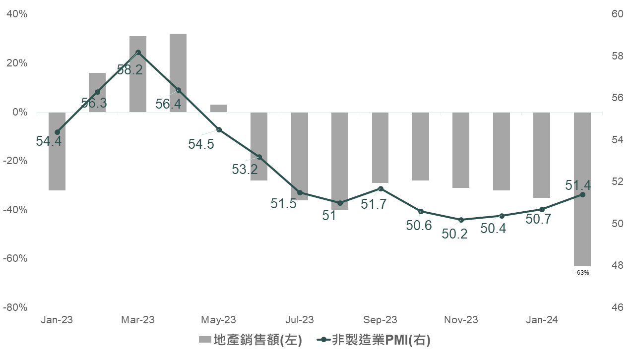 ▲ 中國非製造業PMI及房市銷售年增率走勢;資料來源: Bloomberg(2024/03/01),玉山整理