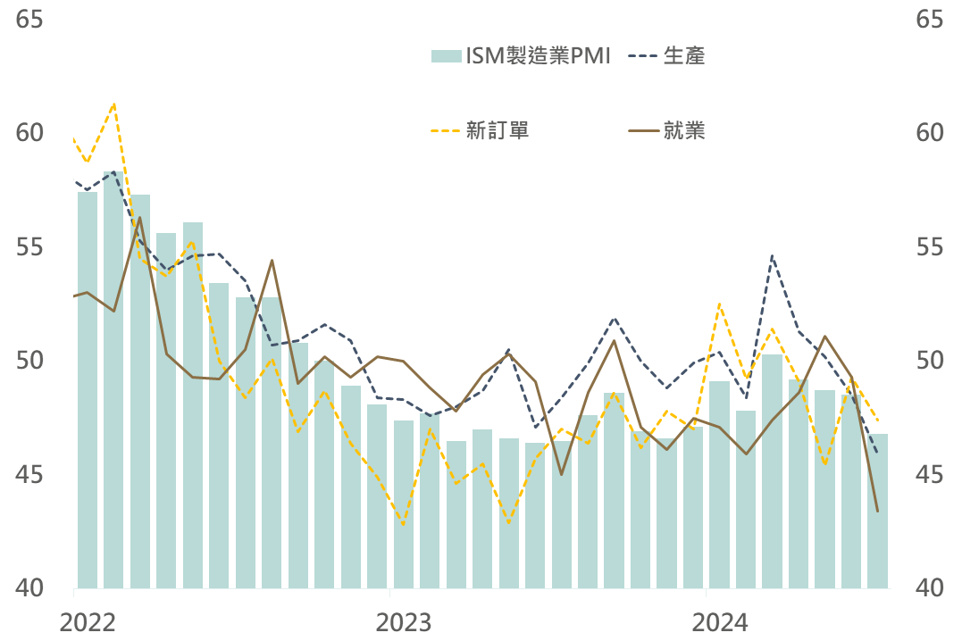 美國公布7月ISM製造業PMI自前月的48.5降至46.8,收縮幅度再呈擴大,且低於市場預期的48.8。其中,細項生產指數自前月的48.5明顯降至45.9,就業指數更自49.3降至43.4。