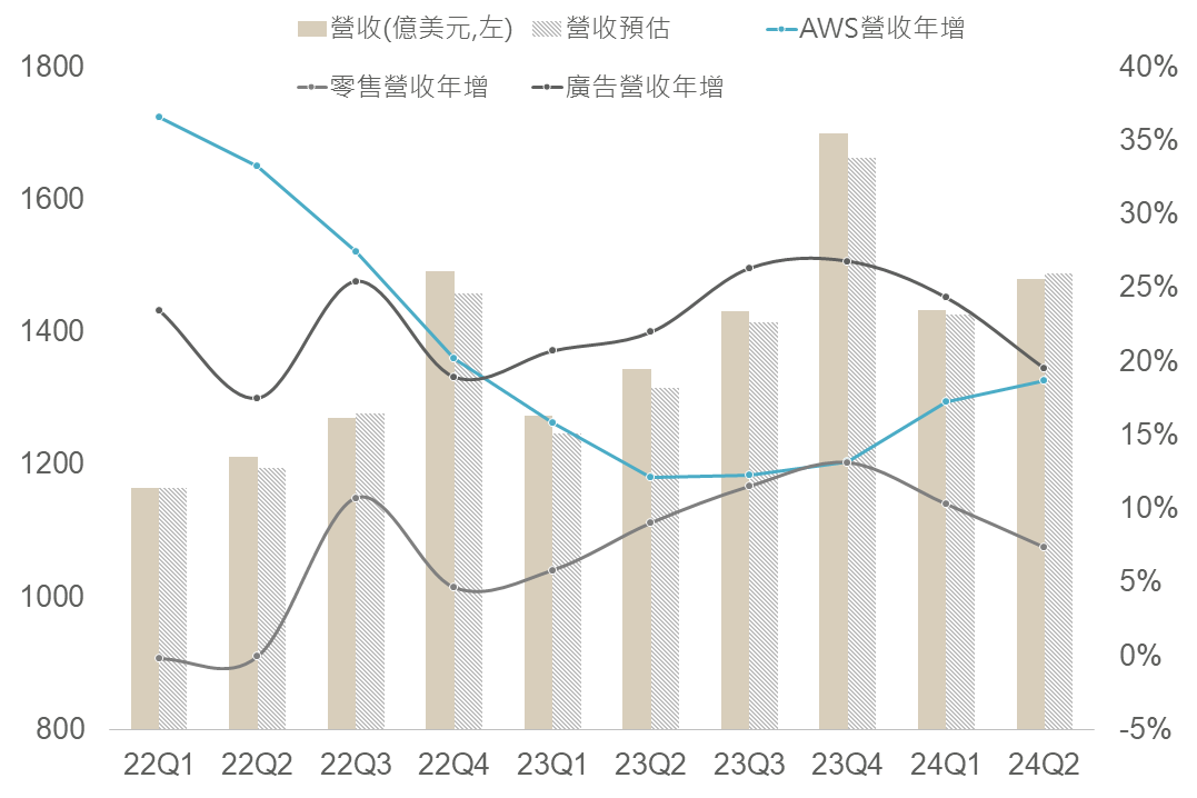 亞馬遜Q2財報,EPS為1.26美元(市場預期1.03),惟整體營收1,480億美元不及市場預期,主要由零售及廣告業務所拖累,主因為「競爭加劇」及經濟前景不明朗,財務長更說到「與預期相比,在收入增長確實有點落後」,而AI部分的雲端AWS營收方面年增19%達263億美元超乎市場預期,然本季財測指引則不及預期,執行長表示歸因於消費之不確定,也促使股價有所波動。