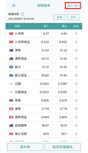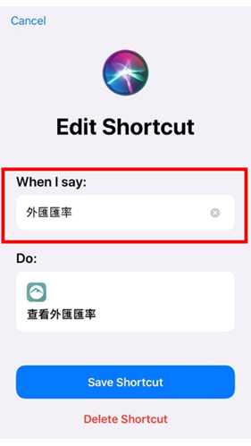 您可點擊右上角「加入Siri」按鈕,並在When I Say欄位中輸入欲更改的字詞,如「外匯匯率」,即可變更呼叫語音。
