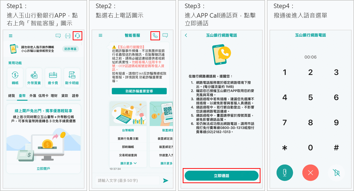 網路電話操作流程:玉山行動銀行APP > 右上角智能客服圖示 > 電話圖示 > 立即通話,撥通後進入 IVR 選單。