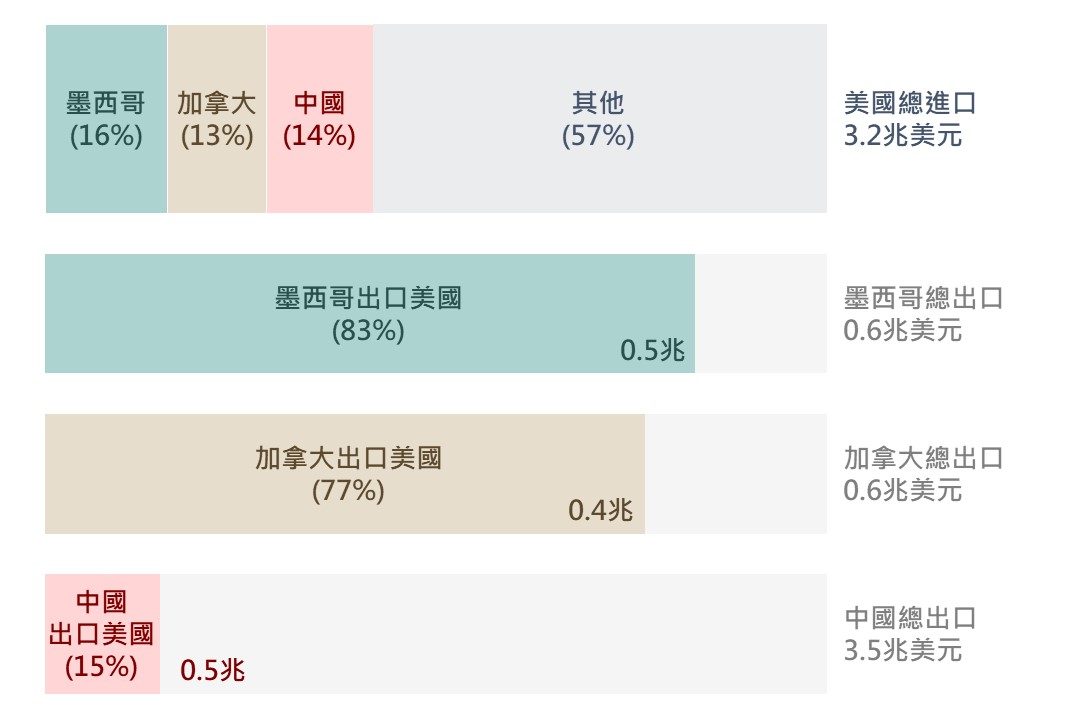 美國總統川普於1/31宣布自2/1起對加拿大及墨西哥徵收25%之進口關稅,對中國則加徵10%關稅(總計稅率估達25%),雖其後加、墨兩國皆於2/2宣布將對美國課徵關稅,惟時不過一日,美國2/3即宣布對加、墨關稅暫緩30天,川普表示暫緩期間將與兩國進行經貿談判。