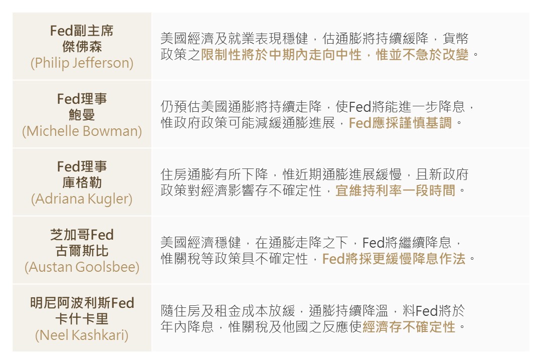 觀察近期Fed官員談話內容普遍認為勞動市場及經濟表現穩健,多數官員預估通膨率將持續走降,Fed於年內亦存降息空間,惟官員皆表示新政府之關稅等相關政策存在不確定性,在此情況下,Fed並不急於調降利率,並將採取更緩慢降息之作法。(預估年內尚有2碼降息空間)