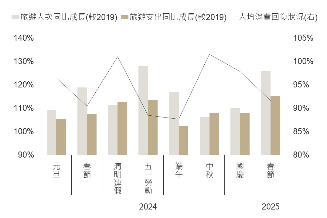 ▲ 中國假期期間旅遊人次以及支出成長率