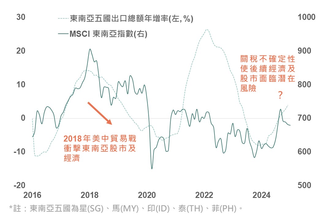 東南亞貿易數據表現與該區域股市正向連動性高,整體出口受科技相關產品帶動維持向上趨勢,然關稅不確定因素使後續經濟情勢及股市走向面臨重演2018年美中貿易戰下的不利局面;而在全球貿易前景面臨壓力背景下,東協央行政策決議也多由過去穩定金融市場及通膨轉更關注增長風險的論調,未來或存在更多放鬆政策機會以對沖美國關稅政策帶來的衝擊,惟此將進一步帶給東南亞各國貨幣貶值壓力。