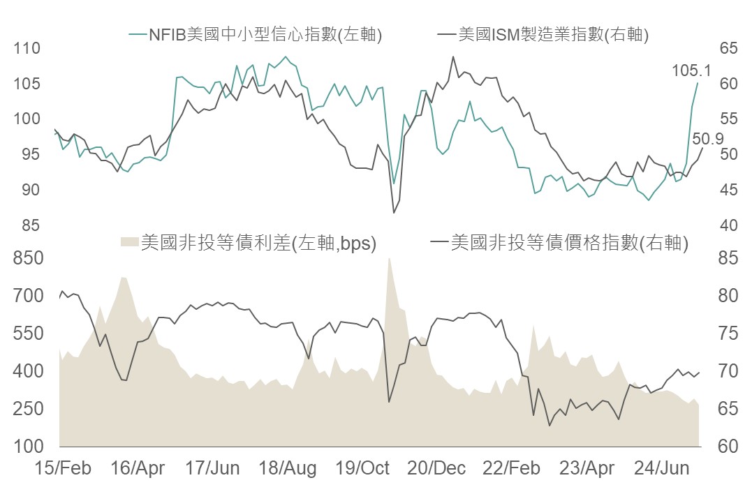 隨川普上任希望製造業回流下,對內將延長減稅措施提振中小企業信心,觀察NFIB美國中小企業信心指數在12月已大幅攀升至105.1,為2018/10月來高位,且1月美國ISM製造業指數也回升至榮枯線上,評估目前美國總經環境將有益於以中小企業為主之美國非投等債表現。