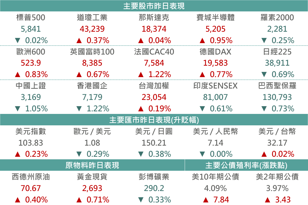 昨日美國公布9月零售銷售數據月比自前月的0.1%升至0.4%,且優於市場預期的0.3%,其中,扣除汽車及汽油之核心零售銷售月比自0.3%升至0.7%,亦明顯優於市場預期的0.3%。整體而言,13個類別中有10個類別呈現增長,包含百貨公司、餐廳及酒吧等項目支出呈現上升,數據顯示美國消費力強韌,而在數據公布後,美債殖利率呈現走高,美股早盤則表現強勢,疊加昨日台積電公布Q3財報結果優於市場預期,驗證AI需求依然暢旺,皆助昨日標普500指數於盤中創下新高,惟指數創高後亦遇調節賣壓,美股盤中收斂漲勢,終場略收於平盤。