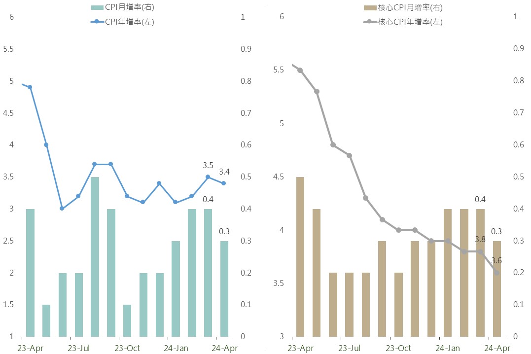 4月CPI月增0.3%,低於預期與前期的0.4%。年增3.4%,與市場預期相同,低於前期的3.5%。