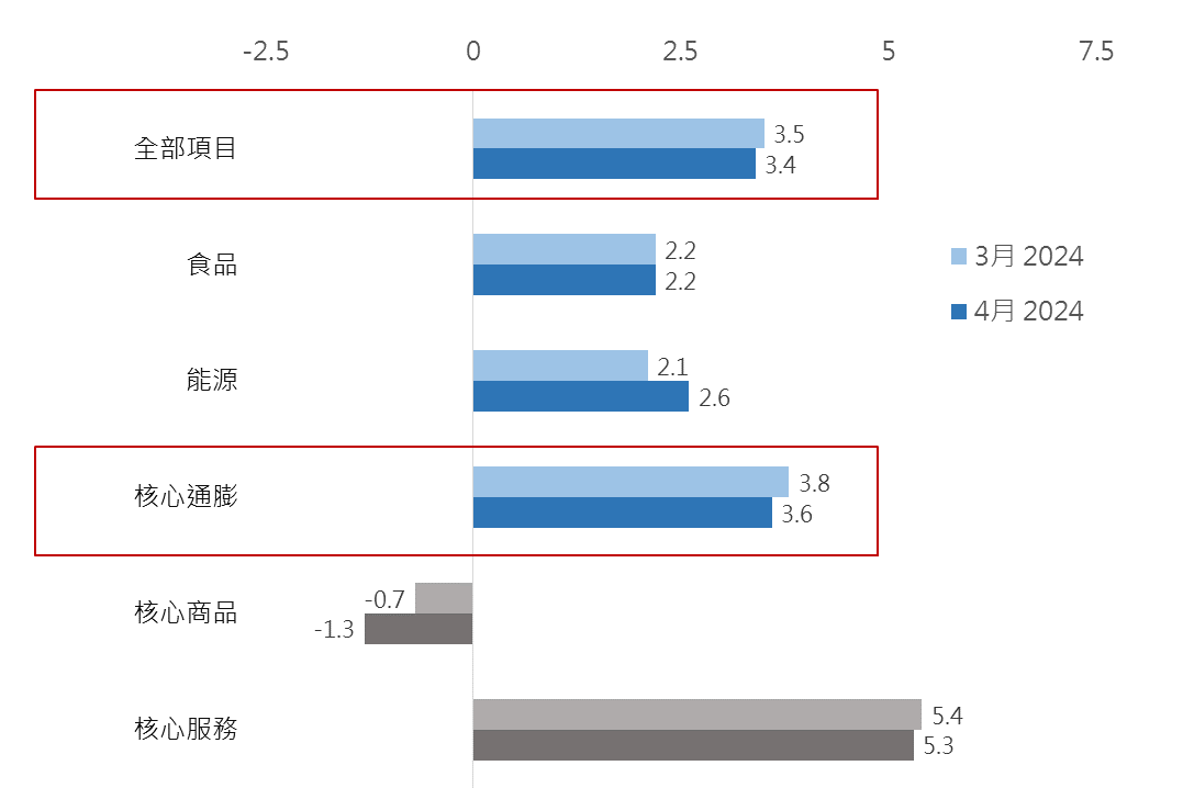 過去1-3月的CPI缺乏進一步進展,使Fed官員紛表示「更多放緩證據出現前,利率應保持在高檔更久」,而此次美國公布4月CPI數據年增 3.5→3.4%、核心CPI 3.8%→3.6% ,雙雙走降且符合市場預期,紓緩市場對於政策更趨鷹派擔憂。