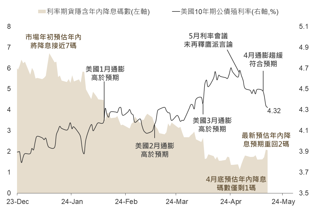 觀察今年市場對Fed年內降息碼數預估,由年初接近7碼一度下滑至僅剩1碼,然5月利率會議後Fed主席鮑威爾未再釋更鷹言論,且4月CPI增幅首度於年內回落並符合預期,使市場對Fed年內降息預期重回2碼,同時也使美10年債殖利率回落至4.32%,雖後續Fed官員或不時釋出偏鷹言論,但目前評估長期CPI增幅仍將回落,預估年底美10年債殖利率將逐步降至4.25%,期間或有波動但預期突破4.6%機會偏低。