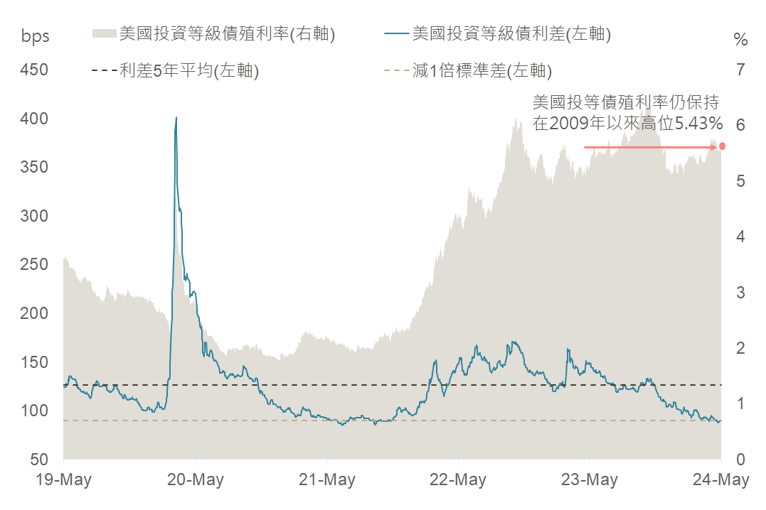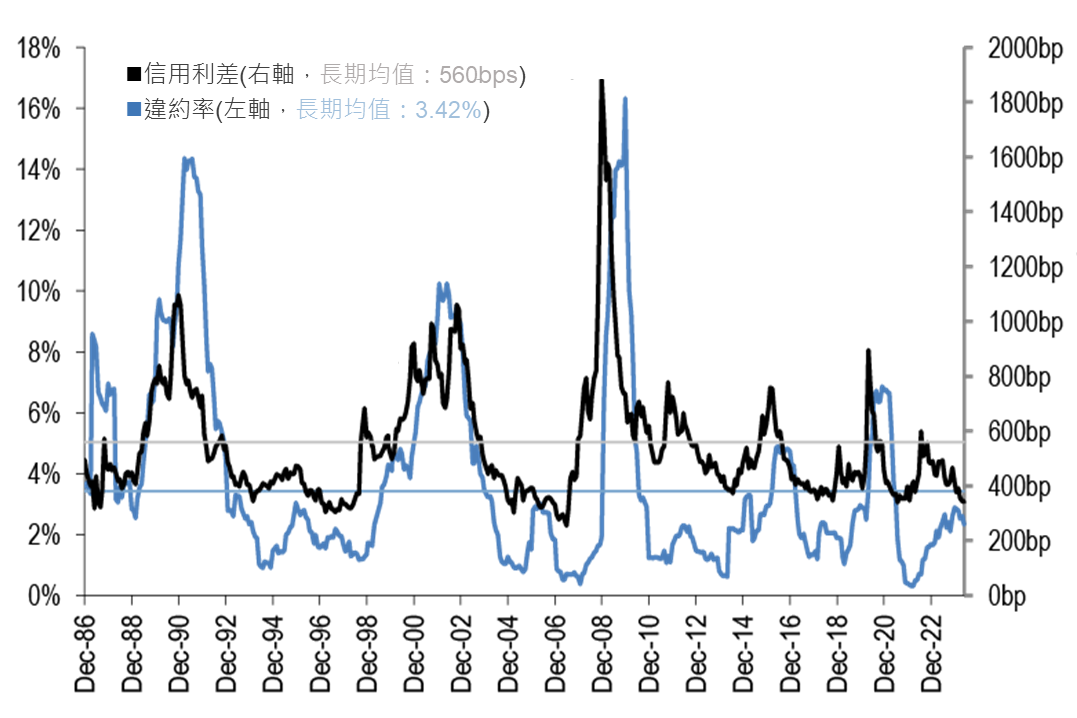 ▲ 美國非投資級債違約率與信用利差 觀察美國公司近一週大舉發行近510億美元公司債,為2月中旬來最高發債規模,然美投等債利差並未因此擴大,反映目前投等債高殖利率優勢仍吸引資金投資債券需求,考量美通膨回落,美債殖利率預期上行空間逐步限縮,建議可趁當前高殖利率下以鎖利角度配置投等債。