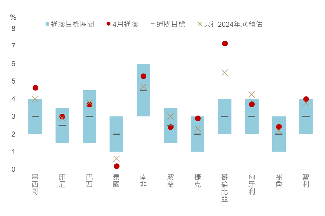 根據IMF新興市場債券價格驅動因素論文中指出,本地債殖利率容易受到國內通膨影響,由於新興央行貨幣政策更加重視通膨,促本地債殖利率因央行升息打擊通膨而上揚,而觀察目前新興國家通膨概況,大部分國家位於目標區間,且央行預估今年通膨於目標區間波動或向目標區間靠攏,顯示新興市場通膨持續受到控制,促本地債殖利率上行空間有限,可待新興市場匯率趨穩後布局本地債。