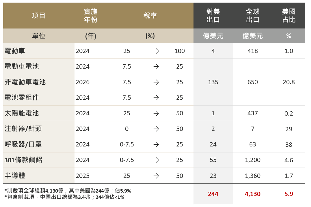 白宮5/14宣布提高對中國依賴度高的進口產品之關稅,然而中國此些項目的主要出口地主要為歐洲地區,據野村統計,中國對歐/美的出口分別為電動車(30%/小於1%)、鋰電池(34%/21%)、太陽能電池(45%/0.2%) ;金額較高的鋼鋁和半導體出口中美國的占比也僅分別為4.6、1.7% ,整體來說,此些項目美國的總額僅占5.9%,且以更大框架來說,此些項目不及中國總出口的1%,因此評估對中影響程度低。