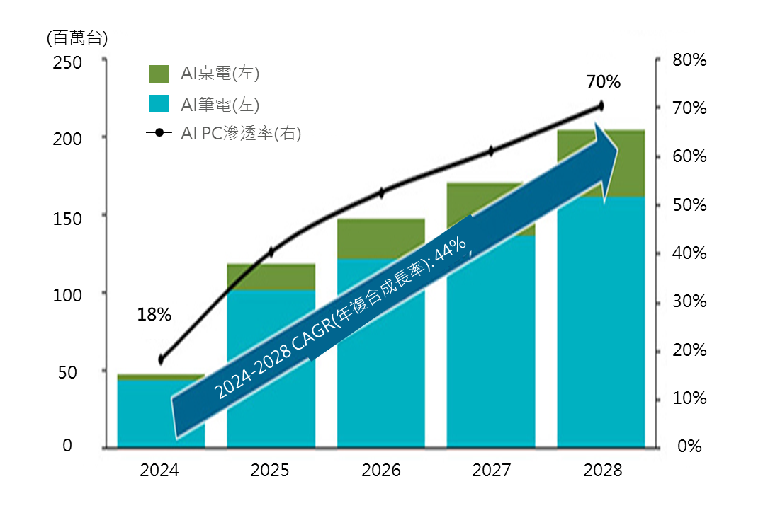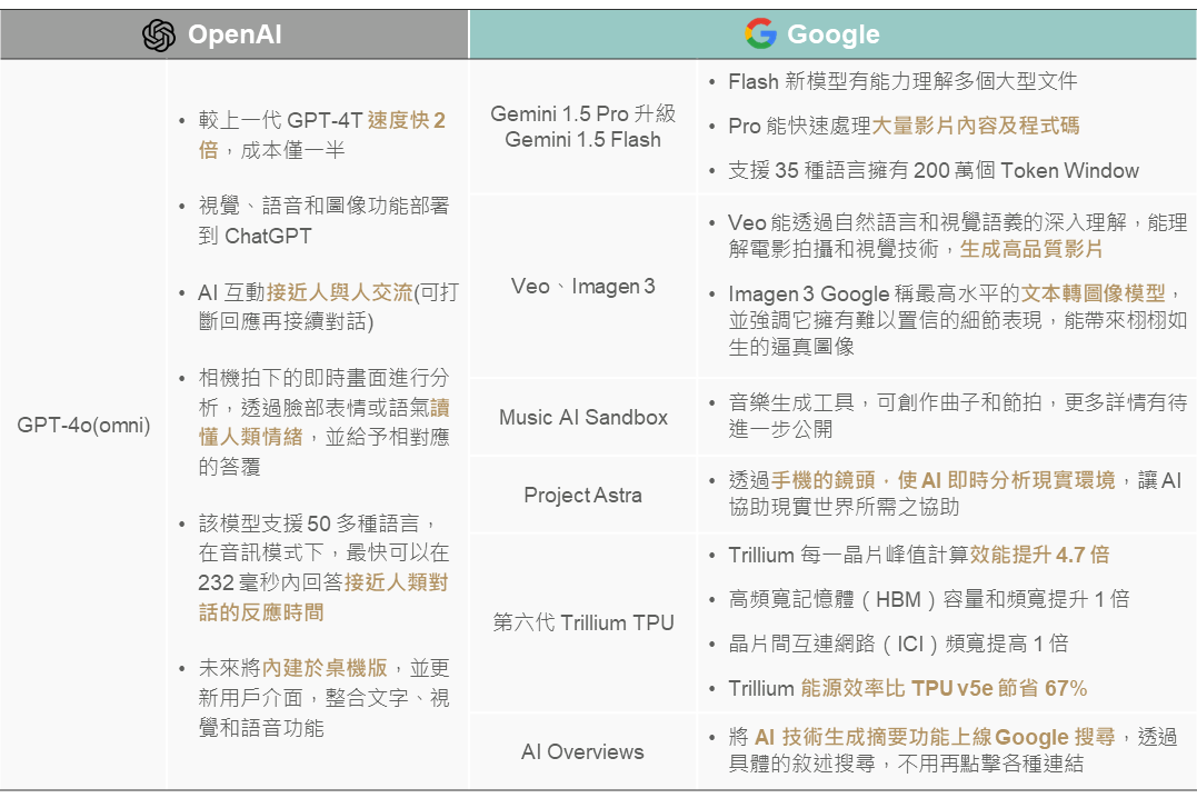 ▲ OpenAI線上發布會及Google I/O開發者大會產品重點整理 至於AI PC而言,Canalys預估今年AI PC滲透率將達到18%,且滲透率將在明年加速成長,長期出貨量年複合成長率將達到44%。PC龍頭華碩近期法說會表示即使目前整體PC市場需求仍然平淡,但AI PC將是下半年重點,除了或將刺激銷量之外,價格的提高亦將對整體產業獲利結構帶來正面發展,故在AI應用逐漸明朗、並樂觀看待下半年換機潮湧現下,建議可趁科技類股逢回時長期布局。