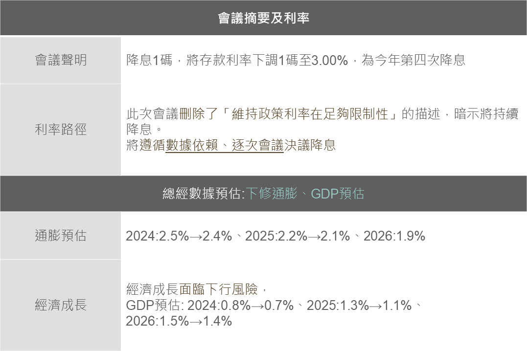 另一方面,ECB 12月會議宣布降息1碼,符合市場預期,並下修未來通膨率及經濟成長預估,雖ECB總裁拉加德提及通膨問題未完全解決,將持續觀察經濟數據、逐次會議判斷未來的貨幣政策,未釋放需加快降息以支持疲弱的歐洲經濟的說法,使會議後歐股小幅下跌,然評估在當前歐洲經濟動能疲弱下,後續ECB仍有可能加大降息幅度。