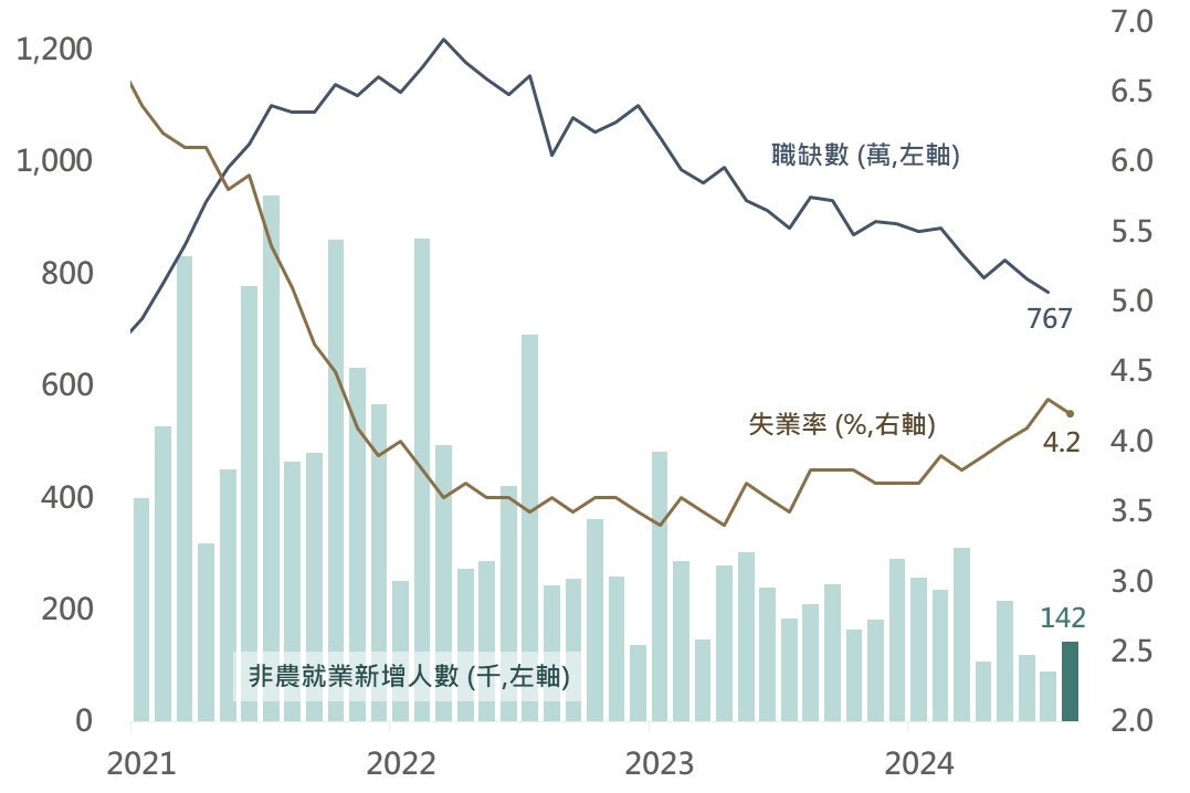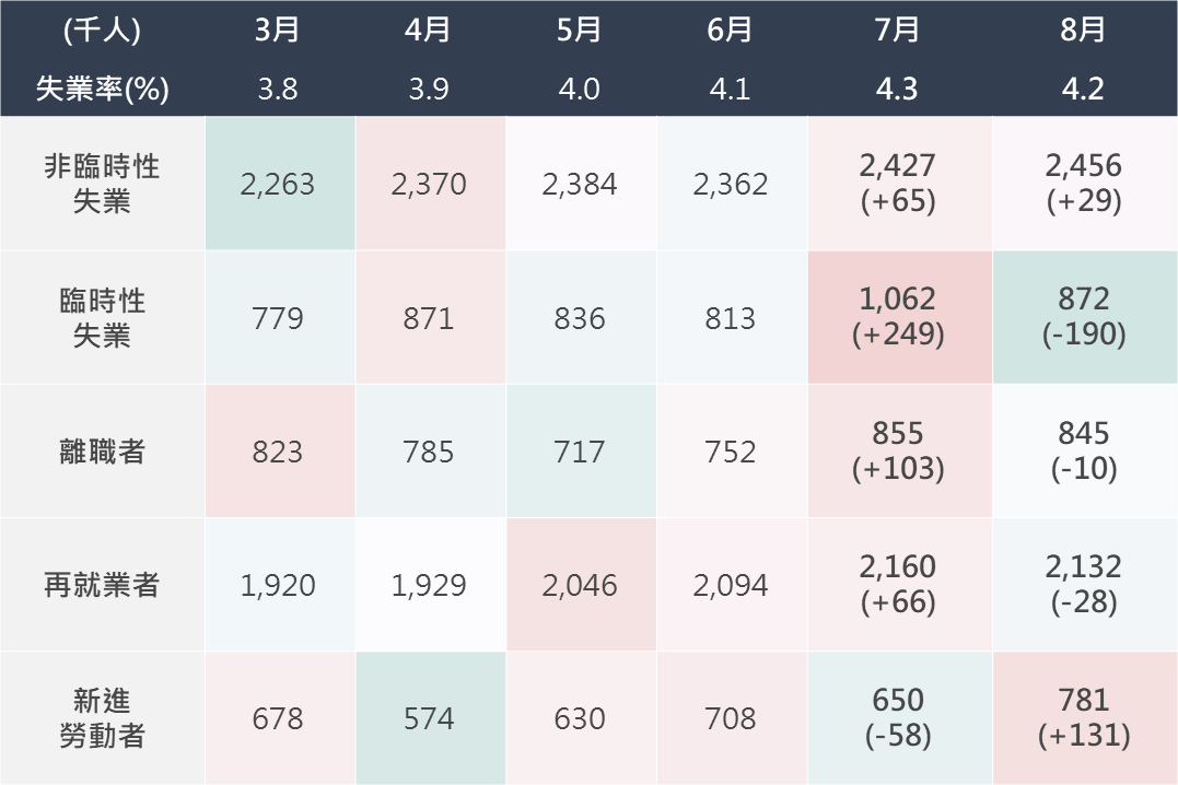 據美國勞工統計局(BLS)公布之最新數據,8月失業率自4.3%降至4.2%,且非農就業新增人數自7月的8.9萬回升至14.2萬,惟仍低於市場預期的16.5萬人,加上7月新增人數遭下修(原11.4萬),皆促使市場擔憂情緒再起。然若觀察失業人口之組成,7月大幅增加之臨時性失業已於8月明顯回降,非臨時性或永久性失業亦未有惡化;評估就業市場雖呈現放緩,惟步入衰退之機率仍低,美國經濟軟著陸仍是基本情境。