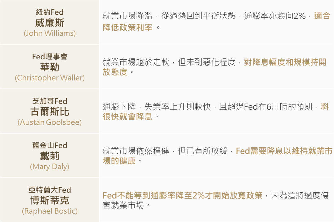 ▲ 美國非農就業新增人數與勞動市場相關數據 ▲ 美國失業率及失業人口之分項組成原因 在美國通膨狀況改善,而就業市場趨於放緩之情況下,觀察近期Fed官員對貨幣政策之談話基調亦轉向鴿派,包含紐約Fed總裁威廉斯及理事華勒等官員皆對降息持開放立場。預期隨Fed於9月展開降息,貨幣政策之限制性亦將逐步放寬,正面看待美國經濟於年底具回升機會。