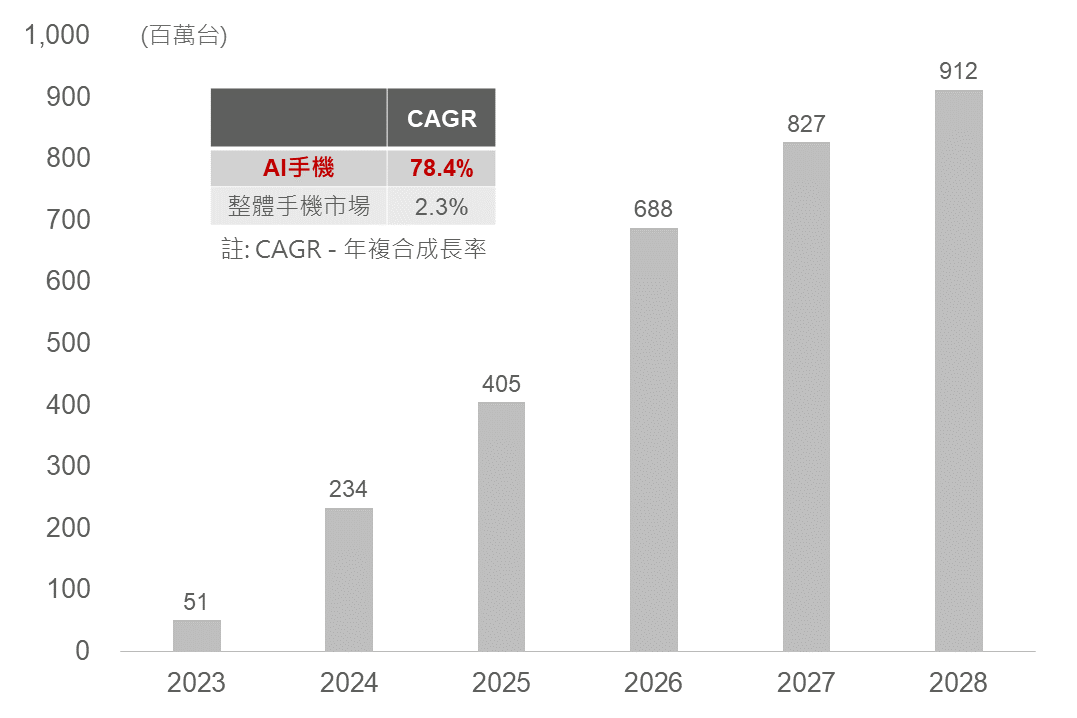 ▲ 近五年蘋果秋季發表會前後蘋果及大盤走勢 整體而言,近期科技股呈現震盪走低,反映AI類股高基期之下,獲利成長動能放緩趨勢,在市場重新對標其未來估值之際,料將使科技股延續震盪行情;惟展望年底消費性電子旺季,以及AI應用透過終端裝置逐漸擴散之下,仍可期待年末至明年初之換機熱潮及科技股行情。 ▲ AI手機出貨量預估