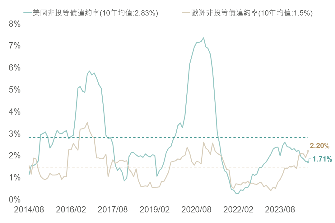 隨8月以來美國經濟數據公布好壞紛雜,市場對美國經濟不確定性增加,同時也牽動對Fed年內降息碼數預估與債券殖利率波動,然考量Fed後續啟動降息循環已大致底定,長期美債殖利率有望趨勢型回落下,建議債券可續持有,並於美債殖利率回彈時加碼布局債券部位。 ▲ 美歐非投等債歷史違約率走勢