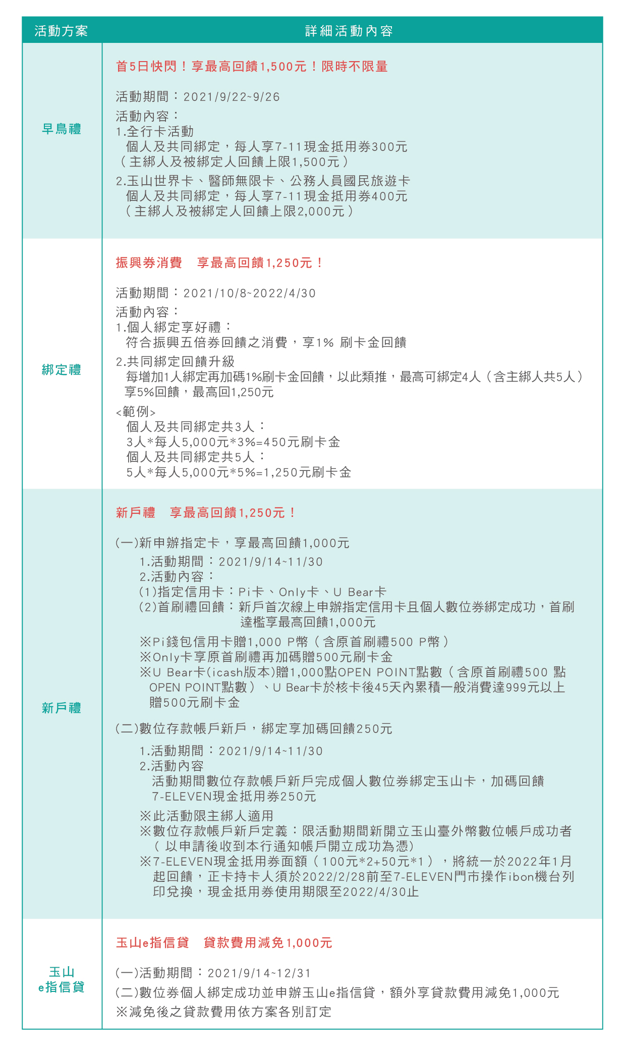 民眾於2021年9月22日至2021年9月26日,將振興五倍券綁定至玉山信用卡,享加碼早鳥禮「7-ELEVEN現金抵用券300元」,除個人綁定享優惠外,每增加1位共同綁定者,可額外獲得「7-ELEVEN現金抵用券300元」(合計最高回饋1,500元)。此外,玉山銀行更推出數位券綁定玉山信用卡消費加碼活動,刷卡消費除可享有原卡片回饋外,數位券再享1%現金回饋,且每增加1位共同綁定者額外加碼1%、增加2位共同綁定者額外加碼2%,依此類推,最高享5%回饋(最高享1,250元回饋)。