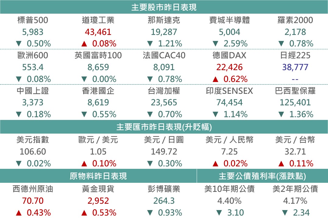 繼上週五公布之標普美國服務業PMI意外自擴張轉收縮(初值:49.7),昨日市場再傳出利空消息,包含微軟取消數據中心租約,使市場對美國景氣及AI需求之疑慮升溫,昨日美股主要指數早盤普遍走低,雖盤中一度收斂跌勢,惟尾盤時段川普宣稱,對加拿大及墨西哥之關稅將於為期一個月的暫緩期結束後生效,利空消息壓抑市場信心,使美股主要指數於盤末進一步修正收低。