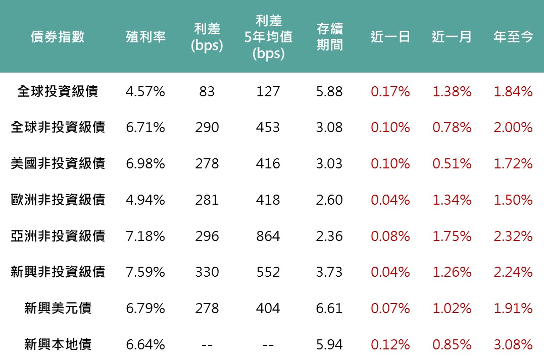 上週五公布的美國服務業PMI與密大消費者信心指數皆低於市場預期之後,市場延續對美國經濟前景的擔憂,疊加川普關稅政策的不確定性引發市場避險情緒升溫,促長天期殖利率回落,另外,昨日財政部標售690億美元2年期公債,一級交易商獲配比例僅6.9%,為歷史新低,顯示市場對2年期公債標售需求強勁,推動短天期殖利率下滑。在各天期殖利率回落之下,各債種普遍上揚,全球投等債上漲0.17%、全球非投等債上漲0.1%、新興美元債上漲0.07%。