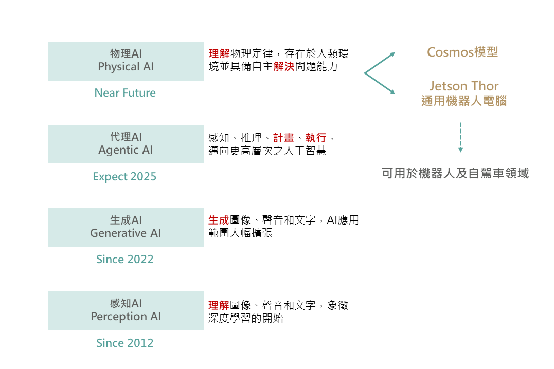 輝達執行長黃仁勳表示,自生成式AI問世以來,AI領域加速發展,預估2025年將由生成式AI邁向更智慧之代理AI,而輝達更致力於發展物理AI,教導AI理解物理定律,並具備自主解決問題之能力,故推出Nvidia Cosmos物理AI開源模型及Jetson Thor通用電腦,以加速發展AI於機器人及自駕車領域。