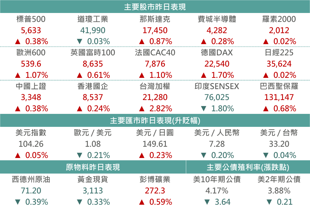 市場持續觀望將於4/2(台灣時間週四凌晨4時)公布之對等關稅結果,而在公布前夕關稅細節消息紛亂,昨日白宮表示,新一輪關稅措施將在4/2公布後立即生效。