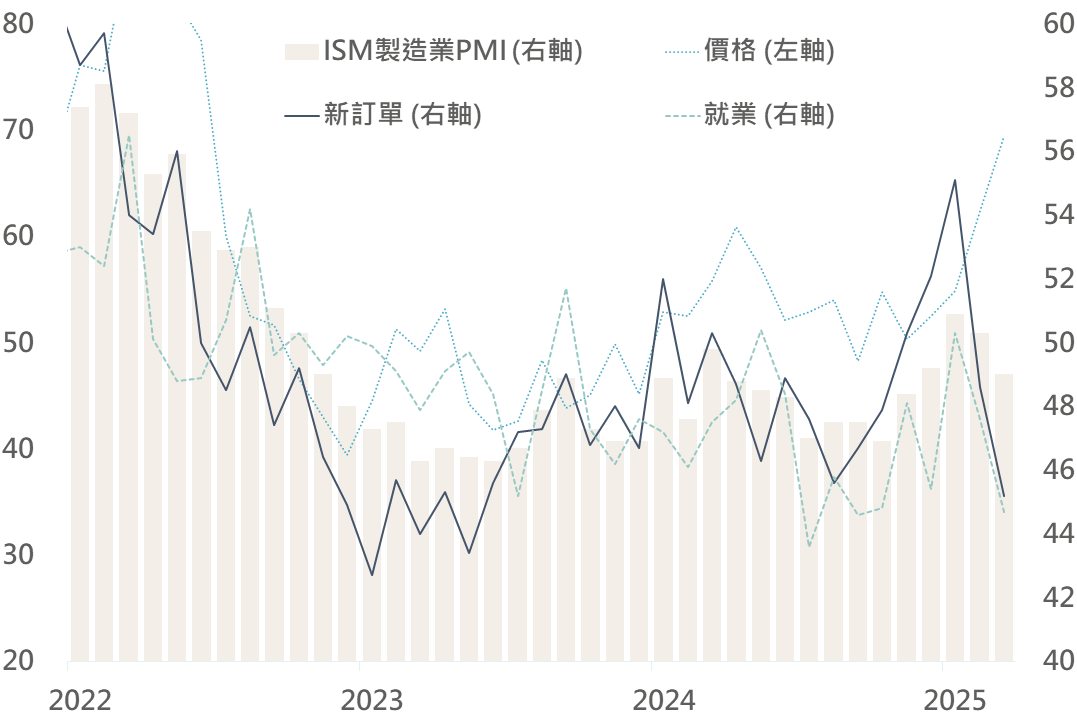 美國公布3月ISM製造業PMI自50.3降至49.0,由擴張轉為收縮,其中細項新訂單指數自48.6續降至45.2,顯示在景氣仍具不確定性下,企業信心及投資亦轉趨保守,促使訂單需求有所放緩;此外,觀察價格指數自62.4續升至69.4,創2022/6以來新高,部分反映關稅政策變化增添貿易及供應鏈混亂,亦推升投入成本提高。