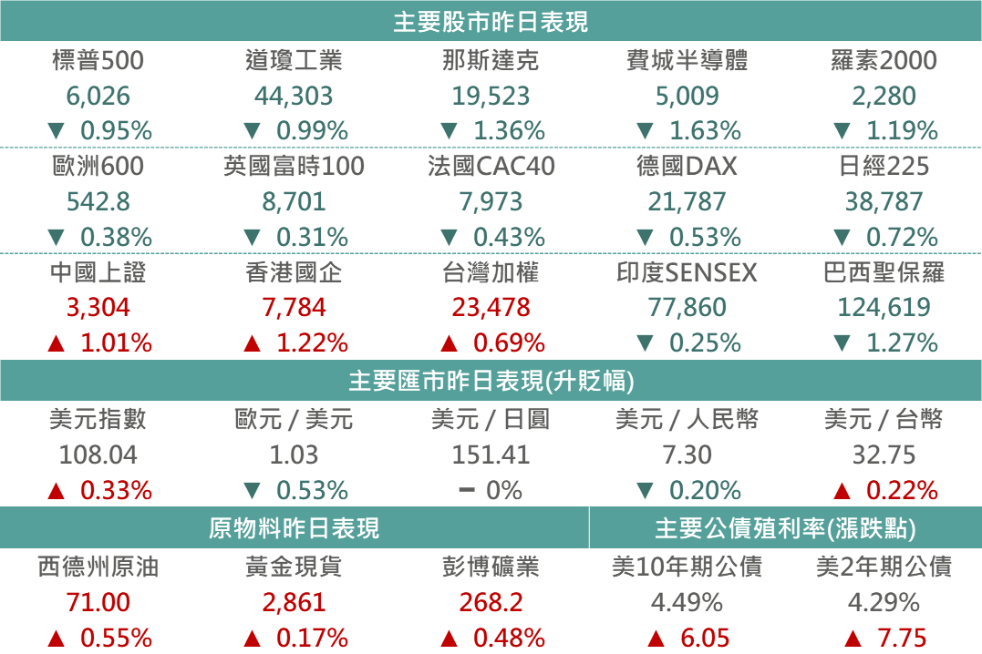 昨日美國公布1月非農就業新增人數僅14.3萬,低於市場預期的17.5萬人,惟失業率降至4.0%,且平均時薪年比維持於4.1%,顯示美國勞動市場依然穩健;Fed理事庫格勒(Adriana Kugler)表示,勞動市場表現仍穩健,惟在美國貿易等政策存不確定性下,Fed並不急於降息,非農就業數據公布後,美債殖利率呈走高。另一方面,昨日美國總統川普於會見日本首相石破茂時宣布,將於下週對多數國家加徵對等關稅(Reciprocal tariffs),關稅消息變化增添市場波動,昨日美股亦轉呈修正。