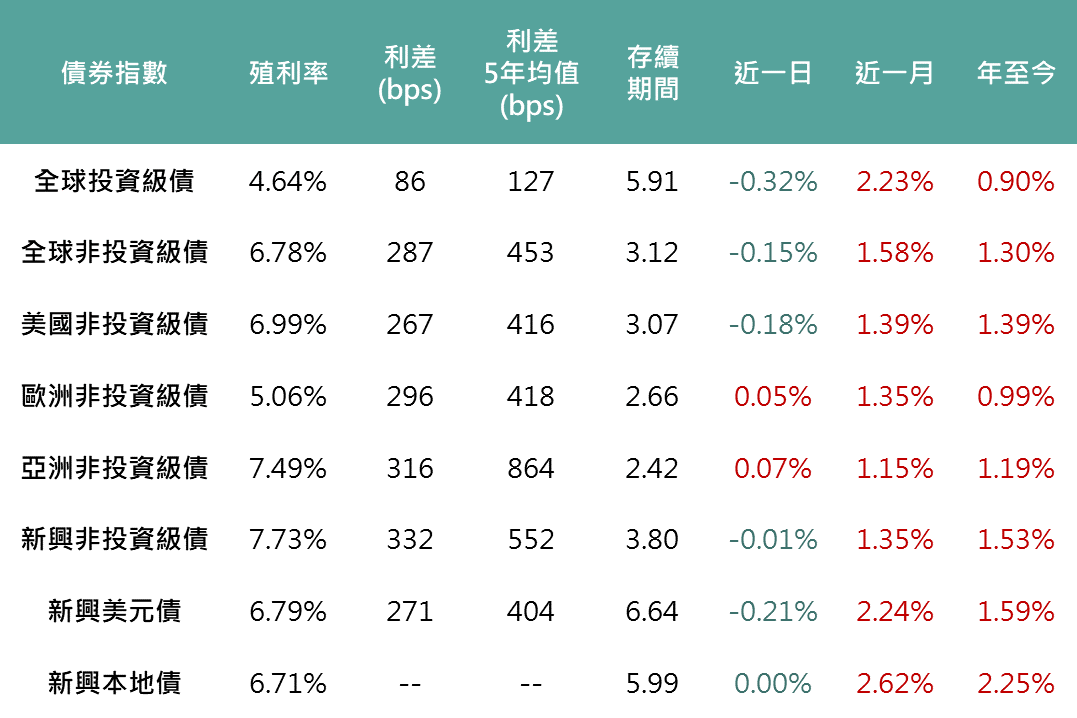 昨日美國公布1月非農就業人數14.3萬人,雖低於市場預期,然11、12月數據共上修10萬人,疊加平均時薪增幅與失業率皆優於預期。市場預期就業數據的公布未改變Fed觀望態度,促美債殖利率走揚,10年期公債殖利率上升6.05bps收4.49%。受美國公債殖利率上升影響,各債種表現普遍下跌,全球投資級債、美國非投資級債、新興美元債指數,收跌0.32%、0.18%、0.21%。新興本地債方面,儘管墨西哥與印度央行降息,然美元兌新興貨幣走強,使新興本地債指數收平。