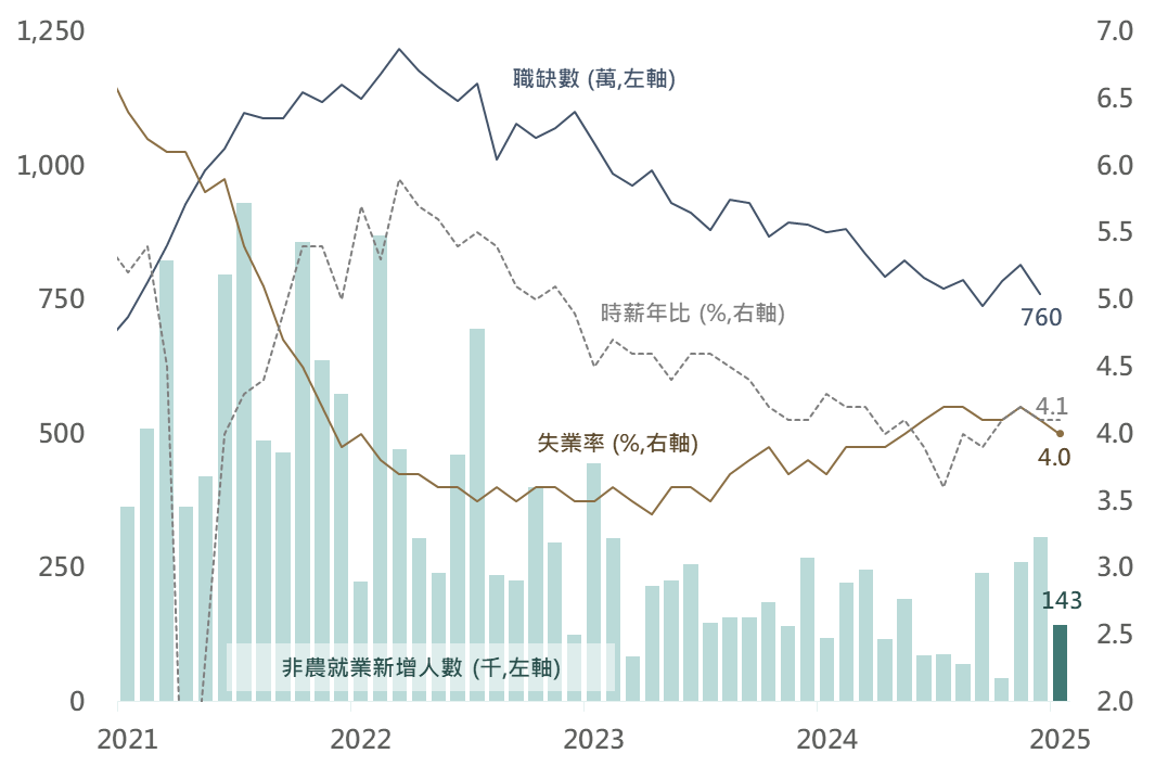 美國1月非農就業新增人數自30.7萬降至14.3萬人,低於市場預期的17.5萬人,惟失業率自4.1%續降至4.0%,且平均時薪年比達4.1%,高於市場預期的3.8%,顯示美國勞動市場依然穩健;其中,醫療保健和零售貿易產業為新增就業主要來源,採礦和天然氣產業則呈減少。然而,據BLS表示,本次公布之失業率數據因應年初之新增就業估計而有所修正,故數據相對前幾個月較無法比較。
