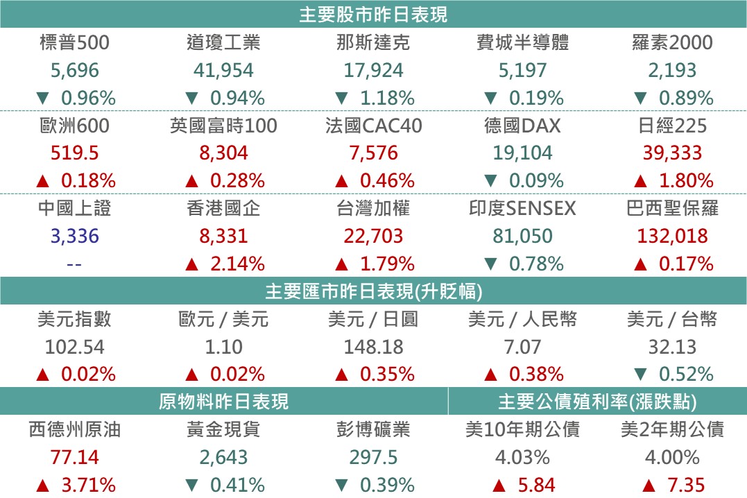 延續上週五美國公布9月非農就業數據明顯優於市場預期,美國經濟數據展現其韌性,促使昨日美債殖利率呈現走升,10年期美債殖利率則升破4%水準;在地緣政治面上,中東緊張局勢未解,消息傳出以色列準備對伊朗採取報復行動,使昨日油價再度上竄。整體而言,市場之不確定性仍存,而本週四美國將公布9月CPI數據,隨後之美國財報季亦將於本週五由銀行股拉開序幕,昨日市場交投轉向保守謹慎,美股主要指數亦普遍收低。