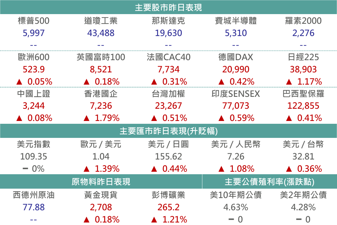 昨日為美國總統川普1/20就職演說,其演說內容包含移民、能源、關稅及地緣戰略位置奪取,整場內容重點著重在邊境移民管控,宣布美國南部邊境進入緊急狀態,而關稅政策相對僅提及成立負責徵關稅的對外稅務局,未明確對中、歐等國重要課徵關稅言論,促使海外股、匯市回升,包含歐股、陸港股期貨,非美貨幣多數兌美元回升,美股則因馬丁路德紀念日休市一日,而美股期貨亦有所回升。