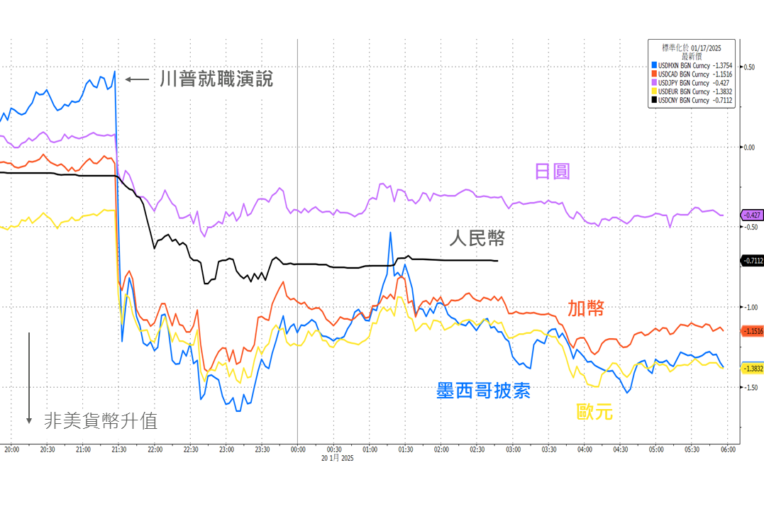 同步受惠川普就職演說對海外關稅著墨較少刺激,推動非美貨幣兌美元升值。