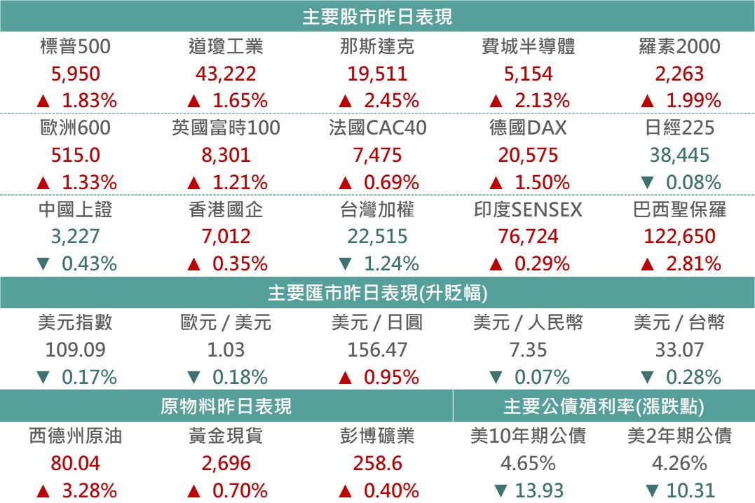 昨日美國公布CPI數據,其中核心CPI增速低於市場預期,緩解市場先前因經濟數據強勁,而過度悲觀預期Fed年內將大幅縮減降息,觀察FedWatch利率期貨顯示,CPI數據公布後市場對Fed年內首度降息時間提前至6月,並增加年內降息2碼預期,降息預期提升促使昨日各天期公債殖利率明顯下行,美國10年債殖利率降至4.65%,而各債種配合債券利差收斂,使全球投等債上漲0.79%、美國非投等債上漲0.59%、新興美元及本地債分別上漲0.75%、0.35%。