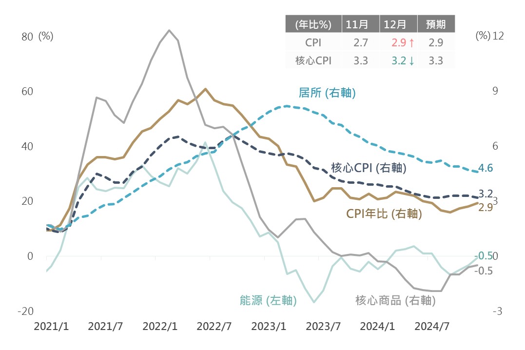 昨日美國公布12月CPI數據年比自2.7%升至2.9%,符合市場預期的2.9%;核心CPI年比則自3.3%降至3.2%,低於市場預期的3.3%。觀察各細項,能源價格月比自0.2%升至2.6%,反映去年末油價走揚影響,然核心商品月比自0.3%降至0.1%,核心服務-居所項月比則持平於0.3%;在核心項目物價增幅表現平穩之情況下,助核心CPI年比延續放緩趨勢。