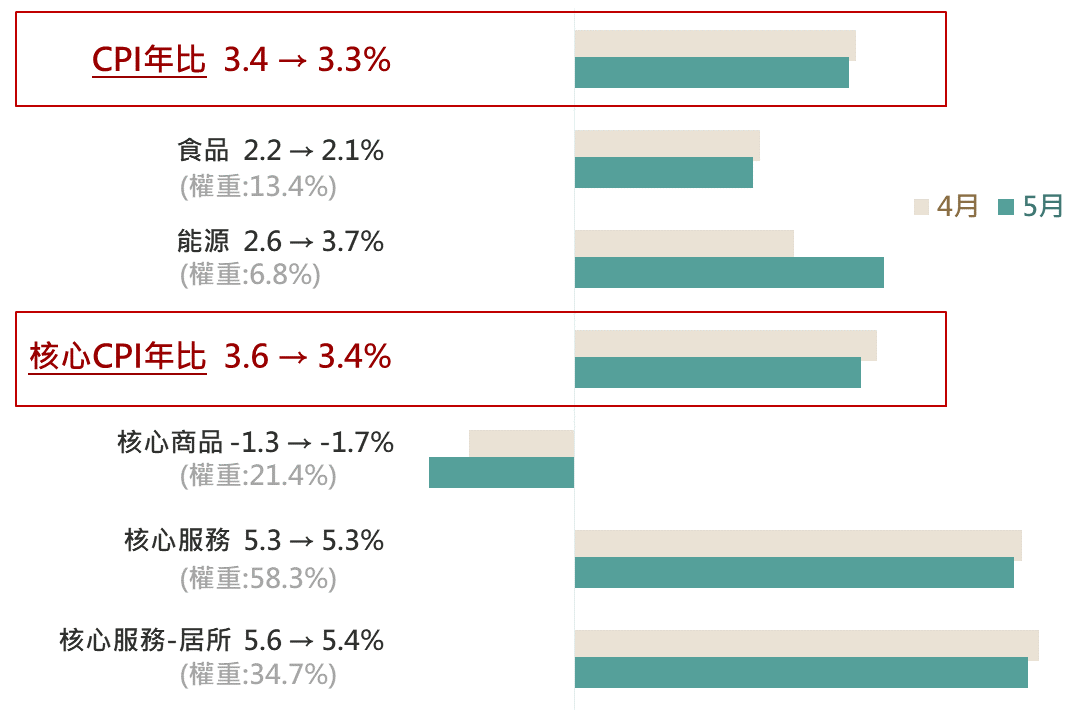 觀察美國公布之5月CPI數據,CPI/核心CPI年比分別自前月的3.4%/3.6%降至3.3%/3.4%,且低於市場預期的3.4%/3.5%。其中,核心CPI年比數據延續下降趨勢且為2021/5以來新低;而市場關注之核心服務-居所項目(權重34.7%)年比雖仍高達5.4%,惟亦較前月5.6%放緩。整體而言,近月美國物價相關數據呈現趨緩,並提振市場對後市通膨獲控之信心,評估在此情況下亦有利市場偏多之格局延續。