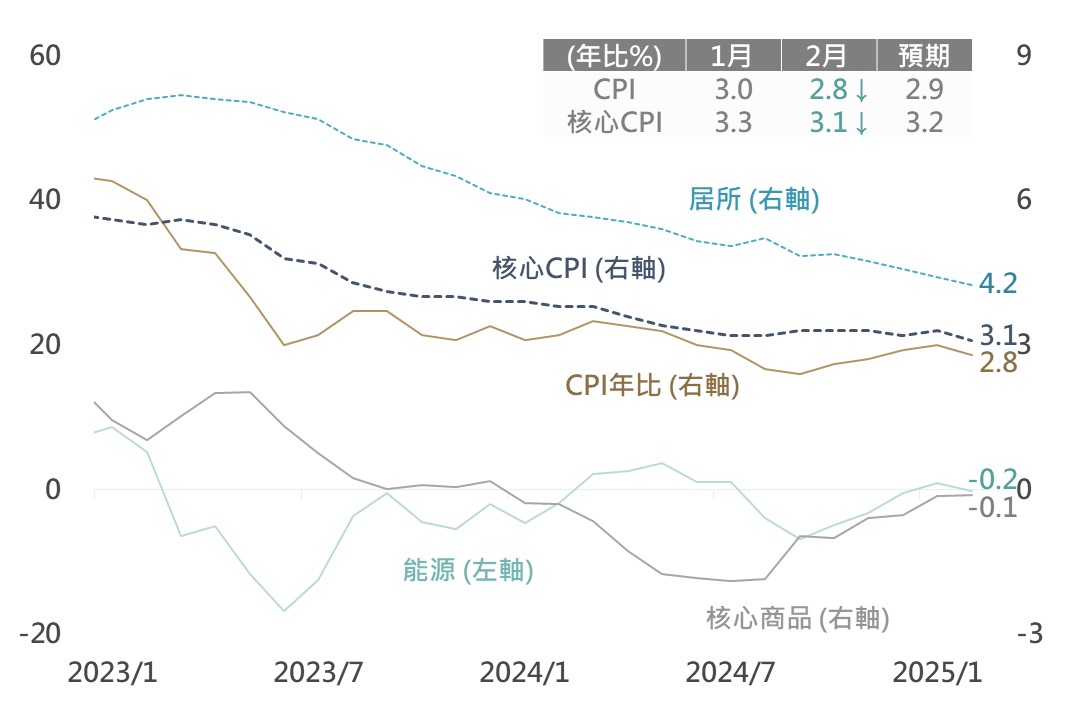 美國公布2月CPI/核心CPI年比分別自3.0%/3.3%降至2.8%/3.1%,且低於市場預期的2.9%/3.2%;其中,各細項物價通膨全面放緩,能源項月比自1.1%大幅降至0.2%,食品項自0.4%降至0.2%,核心CPI月比亦自0.4%降至0.2%,顯示美國在歷經元月之物價變動後於2月呈現回穩。雖市場仍持續關注川普關稅政策對通膨之影響,然就CPI年比數據而言,在能源及核心商品年比表現持穩之情況下,核心服務之居所通膨仍維持下降趨勢,有利整體通膨持續降溫。