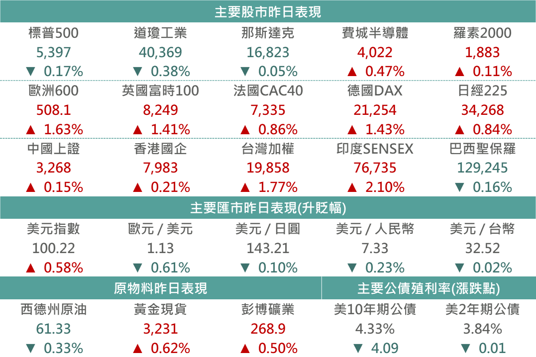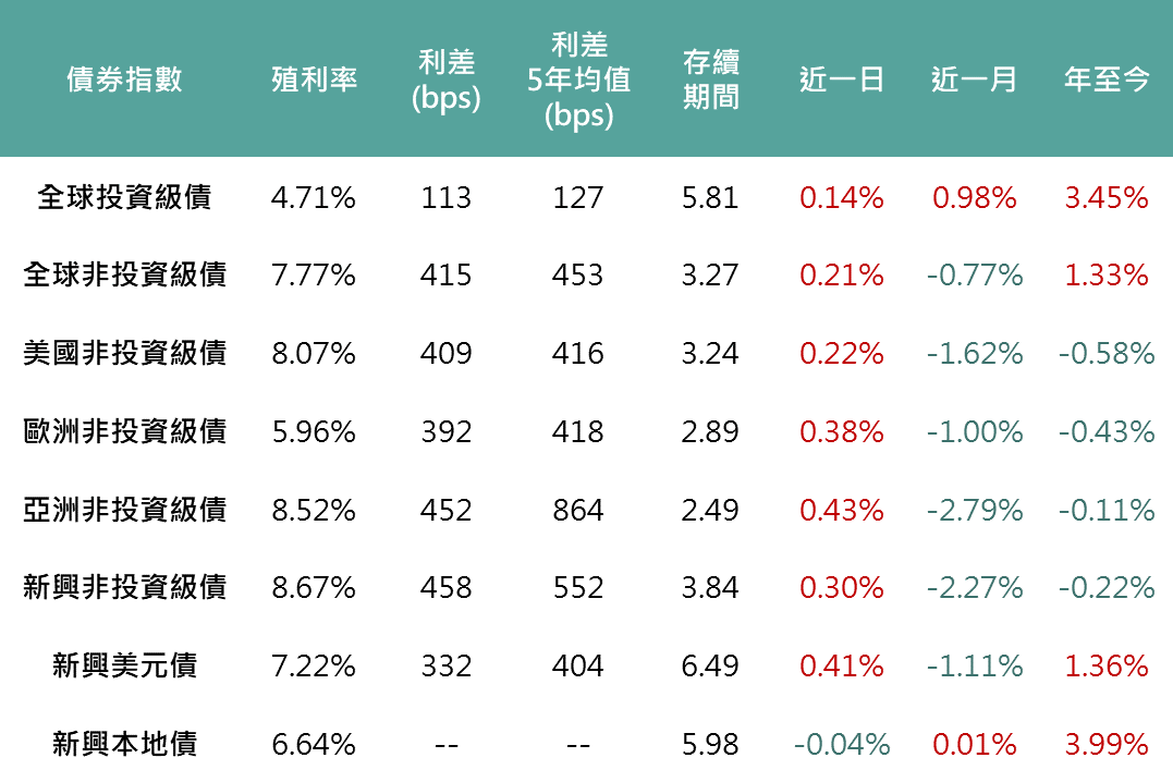 隨部分關稅暫緩及各國與美國貿易談判持續進行,市場情緒轉趨和緩,繼上週市場大幅拋售美國資產後,本週資金重回債市,促昨日美國10年期公債殖利率延續回落,跌4.09bps,收4.33%。市場情緒受提振下,各債種利差持續收斂,促各債種昨日普遍收漲,全球投資級債指數、美國非投資級債指數、新興美元債指數分別收漲0.14%、0.22%、0.41%。