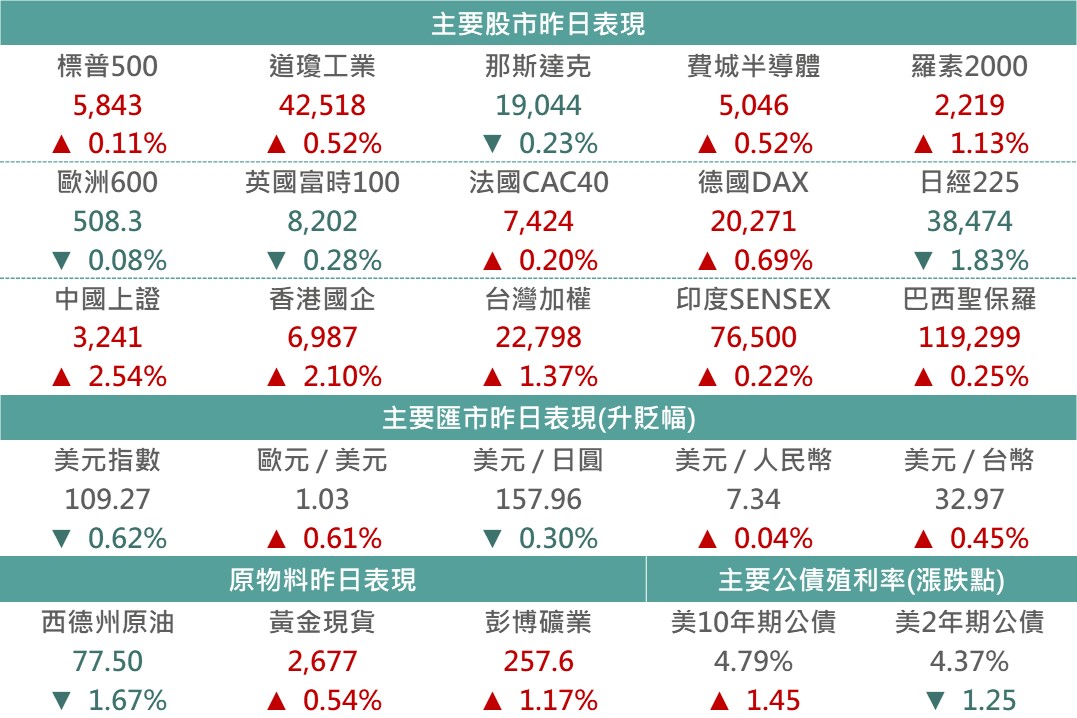 昨日美國公布12月生產者物價數據低於市場預期,公布後美債殖利率一度下滑,然而在市場籠罩川普即將上任的氛圍之下,以及觀望CPI數據公布,促長天期殖利率攀升,殖利率曲線陡化程度加深,而各債種受惠利差收斂,使各債種普遍上漲,全球投等債上漲0.24%、全球非投等債0.28%、新興美元債上漲0.26%,新興本地債方面,墨西哥總統表示將降低與中國貿易往來,同時加強對毒品打擊,有望避免川普立即對其生爭生關稅,促墨西哥披索升值帶動新興貨幣走強,使新興本地債上漲0.38%。